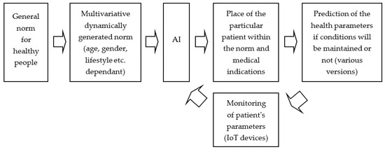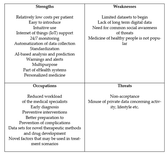 The SWOT (strengths, weaknesses, occupations, and threats) analysis showed the importance of the possible strengths of the proposed system (Figure 2). Weaknesses and threats are similar in all eHealth systems and should be addressed before and during the introduction of an innovative digital healthcare system. These can include the need for better computerization, automation and robotization of diagnosis, treatment, rehabilitation and care. This paradigm, similar to Industry 4.0, is often referred to as Clinic 4.0 [9] or Health 4.0 [10]. The concept of preventive medicine itself is not new. A critical review of six key bibliometric databases returned as many as 102,302 publications with the keyword ‘preventive medicine’ and related words published between 1857 and 2022. However, 78,265 (75.50%) were published in the last 10 years and 49,892 (48.77%) in the last five years. Only 267 publications (0.26%) from 2012–2022 were found on the topic of AI applications in preventive medicine. This demonstrates not only the novelty of the topic of AI application in preventive medicine, but also the need for engineers and interdisciplinary teams to step up their efforts so that innovative technical solutions can sufficiently support this rapidly growing branch of medical care.