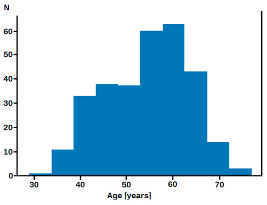 Distribution of patients’ age (N = 303, aged 54.37 ± 9.08).