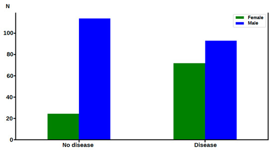 We used datasets from the open database Kaggle (https://www.kaggle.com/ronitf/heart-disease-uci/, accessed on 1 June 2022). The database contains data on 14 parameters collected from 303 patients studied at 4 European research centres. The characteristics we used to predict MI (or lack thereof) were: are age, sex, chest pain type (cp), resting blood pressure (trestbps), serum cholestoral (chol), fasting blood sugar (fbs), resting electrocardiographic results (restecg), maximum heart rate (thalach), presence of exercise-induced angina (exang), ST depression (oldpeak), slope of the ST peak, number of major coloured vessels (ca), and thalium stress results (thal). The characteristics used to predict our target variable (heart disease or no heart disease) are shown in Table 1.