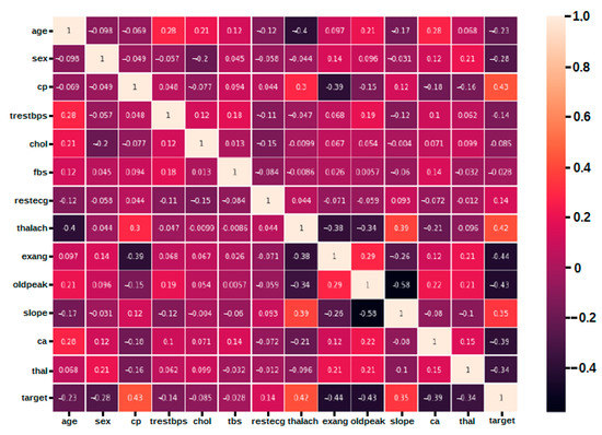 We observed a moderate positive correlations between “cp” and “target” (0.43), and “thalach” and “target” (0.42) as well as moderate negative correlations between “slope” and “oldpeak” (−0.58), “exang” and “target” (−0.44), and “oldpeak” and “target” (−0.43).