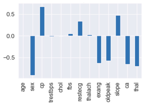 The larger the value (bigger bar), the more the feature contributes to the model’s decision. If the value is negative, it means there is a negative correlation. And vice versa for positive values. For example, the sex attribute had a negative value of −0.904, which meat as the value for sex increased, the target value decreased. Factors with the highest positive influence were: cp, restecg and slope; whereas, the factors with the highest negative influence were: sex, exang, oldpeak, ca, and thal.
