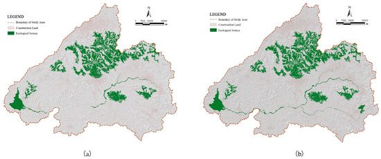 By overlaying the ecological sources identified based on the MSPA analysis, screening for land with a high ecosystem service value and excluding the ecological space with corridor characteristics (Dawen River and Chaiwen River as ecological corridors), 15 ecological sources were obtained, with an area of about 1688.29 km2 (Figure 8b), which is mainly distributed in forest land, such as the Taishan Mountain, the Culai Mountain and the Lianhua Mountain, and water bodies, such as the Dongping Lake and the Dongzhou Reservoir. Taking the geometric center points of 15 ecological sources as the center, according to the size of the ecological source area, two radii of 20 km and 15 km were set as the radiation distance of the source buffer; then, 8847 km2 of the service range of ecological sources were obtained, accounting for 65.15% of the total area of the Taishan area. In order to improve the ecological source service proportionality and the ecosystem functional stability in the Taishan area, the range of the ecological source service was increased to 75%. Combined with the existing provincial nature reserves, national forest parks and ecological protection red line areas, four ecological source sites were optimized and added, mainly for water bodies and woodlands (Figure 8c). Finally, a total of 19 ecological source sites were obtained, with a total area of about 1725.70 km2, accounting for 12.70% of the total area of the study area (Figure 8d).