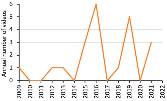 https://www.youtube.com/watch?v=TQZQCywto38 (accessed on 26 July 2022)). Meanwhile, the most recent one was uploaded on 6/5/2021. Year 2016 had the highest number of videos uploaded (