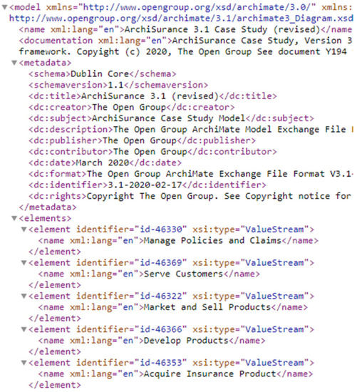 - The Open Group. ArchiMate® Model Exchange File Format for the ArchiMate Modeling Language, Version 3.1. Available online: https://publications.opengroup.org/c19c (accessed on 7 August 2022).