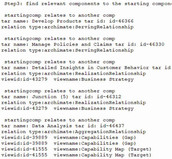 To reuse existing model data to develop the new roadmap artifact, we conducted several slicing tasks to get relevant components concerning several strategic components. Due to the space limitation, we demonstrate the process of using our proposed EAS method for one of the tasks. The task is to find all existing components/IT initiatives that directly or indirectly support one of the planned Business Output, namely, Detailed Insights in Customer in the view of Business Strategy.