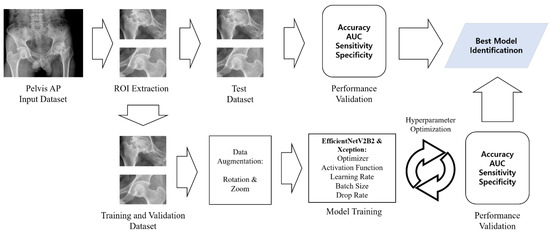 We used Python 3.8.8, TensorFlow 2.8.0 with Keras, and the SciKit-Learn 0.24.1 library to develop a deep learning model for ONFH analysis. We trained two pre-trained CNN models separately using four state-of-the-art CNN models, including EfficientNetV2B0, B1, B2, and Xception. EfficientNetV2 is a lightweight model that reduces the number of parameters by almost 45% compared to the previous version, EfficientNet, but it is an excellent model that shows the same level as EfficientNet in Top-1 accuracy based on ImageNet data. Xception CNN model comprises depth-wise separable convolution layers and shows excellent classification performance compared to Inception V3 and ResNet-152 models [18,19].
