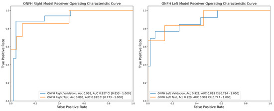 Receiver operating characteristic curve for the validation and test dataset of the anteroposterior pelvic radiographs for the convolutional neural network algorithms for diagnosing osteonecrosis of the femoral head of right and left hips; ONFH, Osteonecrosis of the femoral head; Acc, accuracy; AUC, area under the curve.