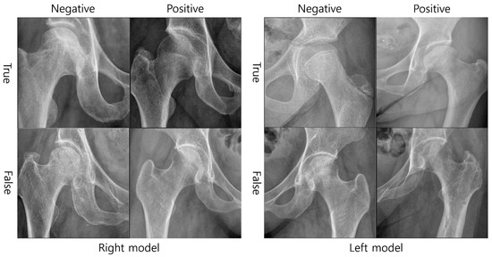 Additionally, Figure 4 shows the actual X-ray images as an example by classifying the diagnostic results of the right and left diagnostic models into correct diagnosis (true negative and true positive) and incorrect diagnosis (false negative and false positive).