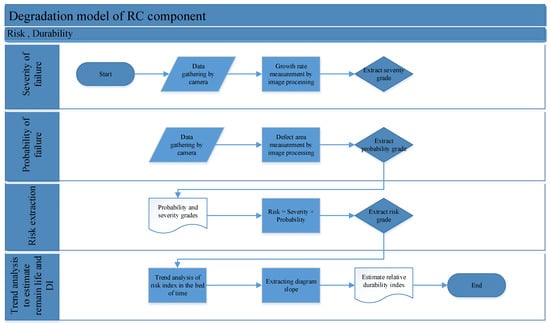 Reinforced concrete (RC) durability is a crucial feature to estimate long-term quality and structural performance. The degradation model is vital for the resource planning of maintenance projects. This model will extract data by updating the status of structures and trending the components’ state over time in terms of durability. Surface erosion, spalling, cracks, and other defects exposed on RC components lead to increase factors adversely affecting concrete durability in structures. This research presents an approach based on automated visualization for extracting quantitative indexes as well as visual inspection without the subjective interspersion of humans or probable human errors during the inspection. The durability index () will extract according to damage probability and defects growth in order to extract the severity of failure and risk. Measurement operation by automated software has been double-checked by manual measurement tools, and data will verify randomly in this method. The results show that, in this component, the damaged area increases by 24% after a definite time. According to degradation models, this component may pass the relative thresholds for the limit for the state of operations to fail. This significant difference between expected time and designing time determines the , equal to 5 out of 10.