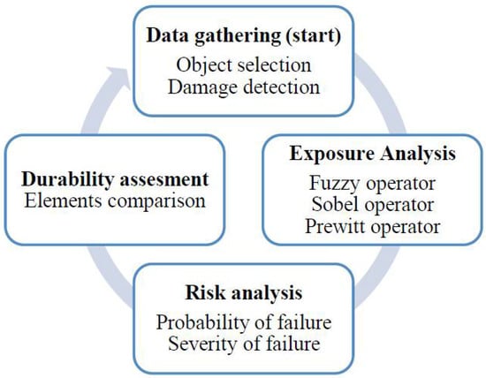 Electrical conductivity is an aspect in terms of structural health monitoring methods which can estimate the durability of reinforced concrete [11]. However, the durability of reinforced concrete after risk analysis is not connected with image processing based on the surface degradation status within a specific time window. This research will focus on this gap to improve condition-based maintenance.