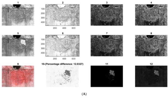 Therefore, the first row in Figure 5A,B (number 1–4) depicts intact concrete before surface damage at the first step of gathering data. The second row in both pictures (number 5–8) demonstrates the damaged surface over time. Therefore, based on Figure 5A, the damages reveal minor damage over a short time. Figure 5B shows significant defects over a longer time when compared to the first image. The third row (number 9–12) is a result of a comparison between intact concrete and damaged concrete over time. As the first data gathering session, based on Figure 5A, revealed a minor defect in a short time, the damaged area is smaller than in the second data gathering session seen in Figure 5B after a longer time. Additionally, the first column in Figure 5A,B (number 1, 5 and 9) demonstrates the greyscale and pure image of the object without noise. The second column (number 2, 6 and 10) shows the result of image processing through fuzzy logic. The third column (4, 8 and 12) illustrates the image processing analysis and comparison using the Sobel algorithm, and finally, the fourth column (number 4, 8 and 12) is the output of the comparison by the Prewitt operator. The software output comprises a comparison between damaged and intact surfaces and is verified by double-checking using manual measurement tools.