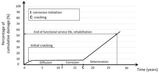 Since durability as a time-dependent probabilistic reliability may be prolonged by the repairs of materials and components, it is necessary to consider temporary durability [45]. Meanwhile, according to Figure 6, RC component degradation intensity status changes over an element’s lifespan. This means that the durability index has to change in each period, not only based on repair activities but also according to a component’s period of life.