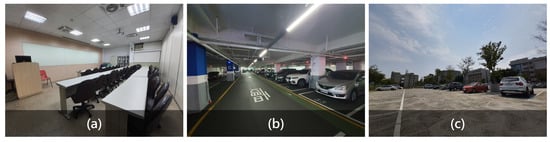 - In the experiments, three scenarios were considered, i.e., classroom, parking garage, and parking lot (shown in Figure 5);