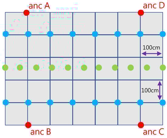 Figure 5. Three scenarios are considered in this paper: (a) classroom, (b) parking garage, and (c) parking lot. - Four anchors were set at fixed positions (red points);