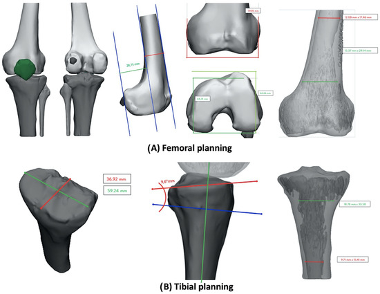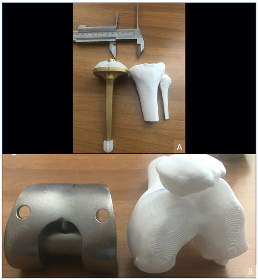 For these reasons, a 3D-printed model, based on a CT scan, was produced by Medics® (Turin, Italy). In this case, as shown in Figure 2A, available data on the femur were Posterior Condylar Offset (PCO = 28.7 mm), medio-lateral femur diameter (59.8 mm), antero-posterior medial (44.2 mm) and lateral (64.6 mm) diameter and distal and proximal medullary canal diameter (distal 15.3 mm × 29.1 mm, proximal 12.08 mm × 17.4 mm). On the tibial side (Figure 2B), available data were antero-posterior axis (36.9 mm), medio-lateral axis (53.2 mm), tibial slope (9.6°) and distal and proximal medullary canal diameter (distal 9.7 mm × 15.4 mm, proximal 18.7 mm × 30.5 mm).