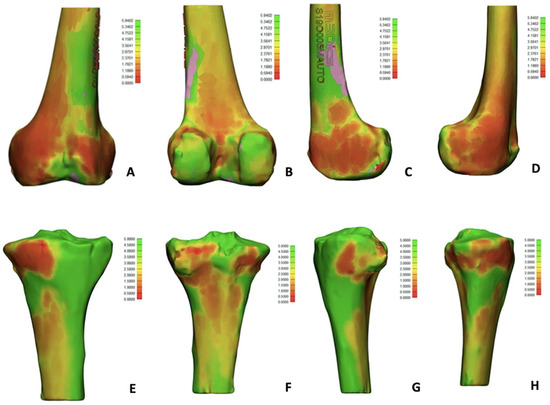 Bone thickness evaluation: red zones correspond to lower thickness (0.1 mm) while green zones correspond to higher thickness (6 mm). (A) Anterior femoral side; (B) posterior femoral side; (C) medial femoral side; (D) lateral femoral side; (E) anterior tibial side; (F) posterior tibial side; (G) medial tibial side; (H) lateral femoral side.