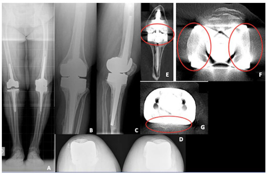 Pre-operative X-rays of the re-revision TKA case. (A) Long-leg weight bearing view; (B) antero-posterior view; (C) lateral view; (D) patellar view; (E) coronal view of a computer tomography (CT) scan demonstrating tibial bone loss (red circle); (F) coronal view of a CT scan demonstrating femoral artifacts (red circle); (G) axial view of a CT scan demonstrating tibial artifacts (red circle).