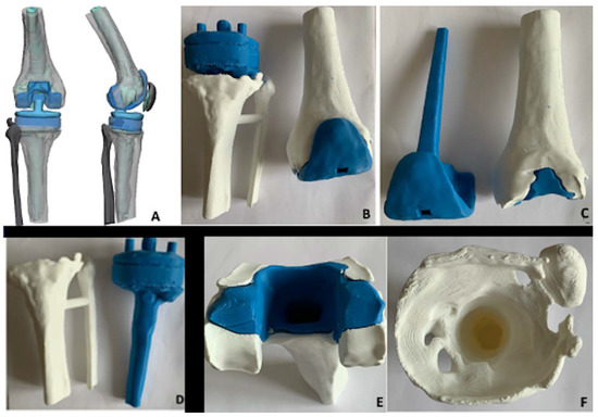 Three-dimensionally-printed model of the case. (A) Image by the company (grey bone, blue implant, light blue cement); (B) 3D model femoral and tibial component; (C) 3D femoral model with implant separated from bone-cement; (D) 3D tibial model with implant separated from bone without cement; (E) 3D femoral model showing bone (white) and cement (blue); (F) 3D tibial model showing tibial bone loss.