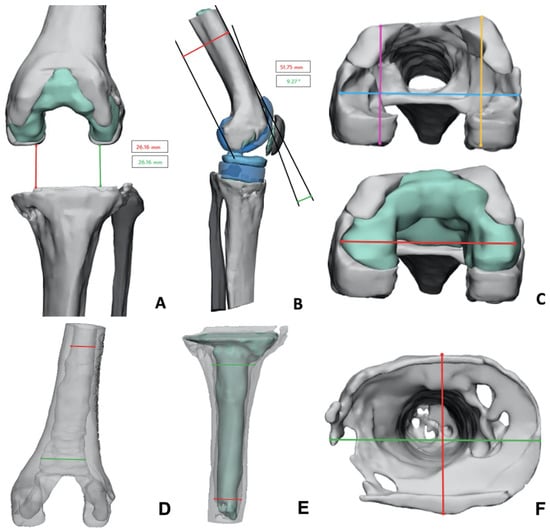 Data provided with the 3D-printed model. (A) Femoral-tibial gap (red and green line); (B) femoral component lateral positioning; (C) femoral diameters (mediolateral diameter for cement red line, mediolateral diameter for bone light blue line, antero-posterior medial diameter purple line, antero-posterior lateral orange line); (D) intramedullary femoral canal diameter (distal red line, proximal green line); (E) intramedullary tibial canal diameter (distal red line, proximal green line); (F) tibial bone loss and diameter evaluation (mediolateral green line, anteroposterior red line).