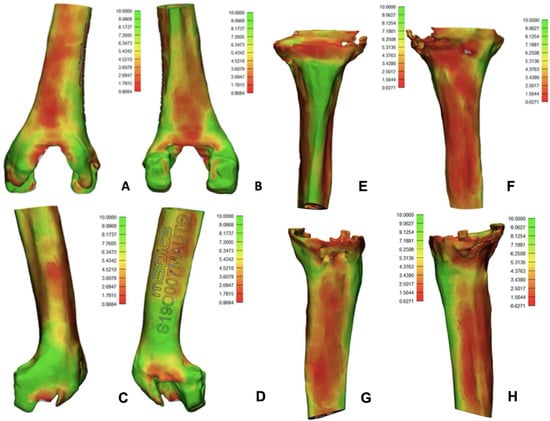Data provided with the 3D model regarding bone thickness (low thickness red color, high thickness green color). (A) Anterior femur; (B) posterior femur; (C) medial femur; (D) lateral femur. Al the femoral images showed low bone thickness at the femoral cortex. (E) anterior tibia; (F) posterior tibia; (G) medial tibia; (H) lateral tibia. All tibial images show poor bone thickness except for anterior tibial cortex.
