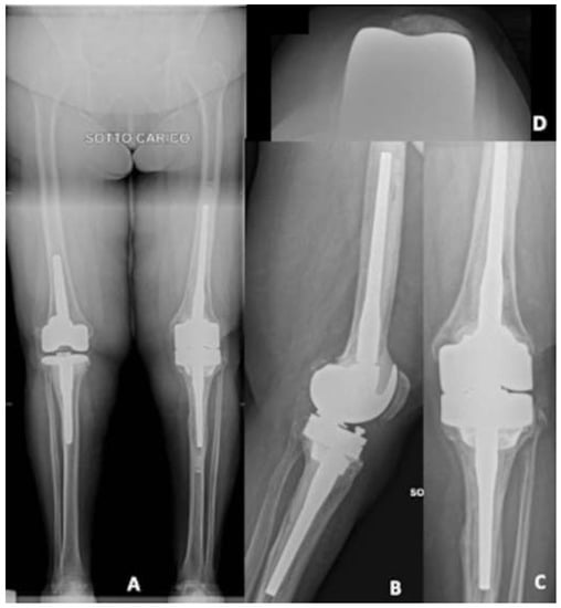 Pre-operative X-rays evaluation: (A) long-leg weight-bearing view; (B) lateral view; (C) antero-posterior view; (D) patellar view.
