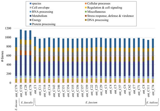 Taxonomic classification with Kraken2 and TYGS corroborated the strain identification of Tsigkrimani, et al. [10,11]. From the 30 strains included in this analysis, 25 (83.3%) were classified as E. faecium, while three isolates of E. faecalis, two isolates of E. italicus, and one isolate of E. durans were found. Details and assembly statistics are presented in Table 1. The average genome size was 2.79 ± 0.15 million bases (Mb), the average GC content was 37.92% ± 0.40%, while the average number of coding sequences (CDSs) was 2850 ± 179, where ± denotes the standard deviation of the average. No significant difference between Enterococcus species was found for these genomic features. Subsystem analysis with the COG database revealed the presence of 11 enriched subsystem categories (Figure 1). The process category of metabolism was the most enriched one with 333 (±40) genes, on average. This category was significantly more enriched (p < 0.05) in the isolates of E. faecalis compared with those of E. faecium (ent_C28, ent_C78 and ent_C158). Together with metabolism, protein processing (209 ± 5), energy (120 ± 10), and stress-response-virulence (101 ± 5) processes constituted the majority of CDSs with known functions (Figure 1).
