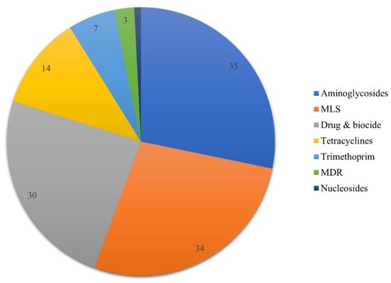 Analysis with Abricate and the Resfinder database revealed the presence of 124 RGs in the collection of Enterococcus spp., conferring resistance to aminoglycosides, macrolides, lincosamides and streptogramines (MLS), drug and biocide resistance (efflux pumps) and tetracyclines (Figure 2). Less frequent types of resistance were those to trimethoprim, nucleosides and of efflux pumps conferring multi-drug resistance (MDR). Enterococcus spp. isolates carried four AMR genes, on average, while all (n = 30) isolates carried at least one AMR gene. Details on the RG-content per isolate are presented in Supplementary File S1. The most prevalent types of resistance were those to drug and biocide resistance and MLS, with 90.0% of isolates carrying at least one related gene, followed closely by aminoglycoside resistance (86.7%).