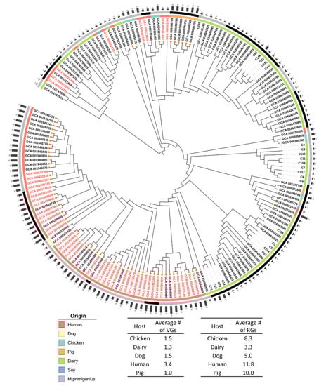 One additional finding of our analysis, which was visually observable in the annotated tree, was the difference in terms of total RG-content between different origins, with human and pig isolates showing higher numbers of resistance determinants and strong association with vancomycin-resistance genes (Figure 4). We confirmed this pattern statistically with Scoary and found significant differences in the total number of RGs and VGs between source of isolation. More specifically, dairy isolates carried the lowest number of RGs (Figure 4) and their RG content was significantly different (p < 0.05) from all other sources except for dog isolates. Moreover, the RG analysis showed that the van-like resistance and regulator genes, which respectively encode and regulate resistance to vancomycin and other glycopeptides, were predominant in human E. faecium isolates and even more abundant in isolates from human bloodstream infections and UTIs (Figure 4). Regarding the VGs, significant differences (p < 0.05) were found only for the human VG-content versus all other origins (Figure 4).