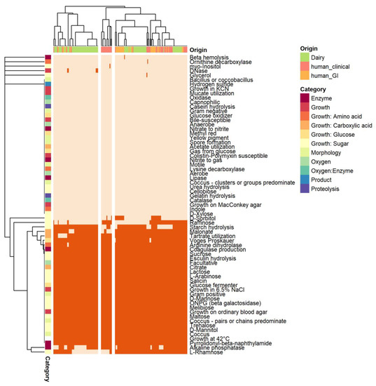 Lastly, analysis with Traitar for predicted phenotypic characteristics showed that, irrespective of their origin, all isolates can utilize sugars, such as lactose, galactose, maltose, sucrose, and D-mannitol (Figure 6). The clustered heatmap of predicted traits indicated an overlap of dairy and human origin isolates as well as a separate human–clinical cluster. Statistical analysis for phenotype enrichment provided more insights for this arrangement. Dairy-origin isolates had a strong association (OR > 1, p-value < 0.05) with the utilization of starch and malonate, whereas human origin isolates were found to be significantly related with the catabolism of L-rhamnose, D-sorbitol, and raffinose.