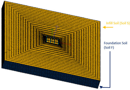 3D view of the numerical model (Model B1, B2 and B3). Soil S: Infill soil (Yellow); Soil F: Foundation soil (Blue).