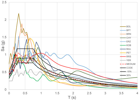 The seismic scenario consists of ten input motions selected from the NGA database in order to verify that the mean of the spectrum values of the sets of accelerograms is located between the −10% and +30% of the code-based spectrum, following the Eurocode 8 (2004) prescriptions, by considering the life-safety limit state (return period of 475 years, lat.: 42.333 N, 14.246 E, S = 1.50714, Tb = 0.257 s, Tc = 0.770 s, Td = 2.538, Cc = 2.02847), as shown in Figure 4. Table 5 shows the characteristics of the selected input motions in terms of peak ground acceleration (PGA).