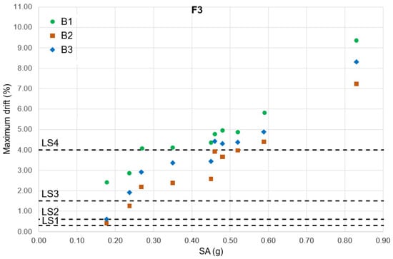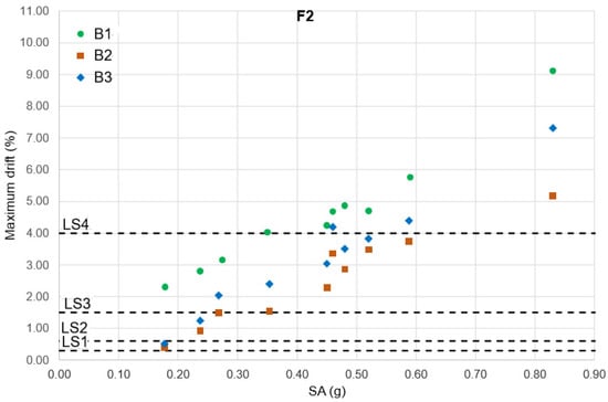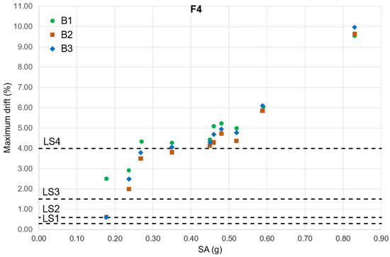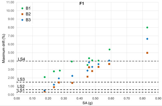 The results of the performed models for the four soil conditions are shown in Figure 5, Figure 6, Figure 7 and Figure 8 in terms of maximum longitudinal drifts for the considered seismic scenario. The limit states (LS1, LS2, LS3, LS4) are shown with horizontal lines in order to define the occurrence of exceedance. This condition is fundamental to derive the L on the basis of Table 4. In particular, Table 6 shows the state limits exceeded (for every configuration) deduced from the results (Figure 5, Figure 6, Figure 7 and Figure 8). In particular, the columns represent the condition of exceeding the four limit states for the selected models (models B1, B2 and B3 and for the foure soil conditions: F1, F2, F3 and F4).