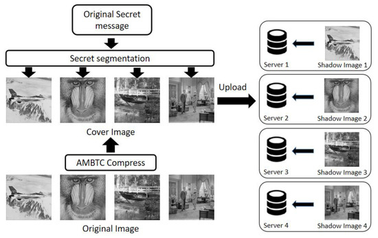 The Shamir threshold scheme can be used to segment the original secret message and store the subsecret messages in different servers, thereby it can improve the confidentiality and fault tolerance of the original secret message. However, the shadow images generated by these methods are often meaningless and easily attract attackers’ attention. These shadow images cannot be effectively compressed. In this paper, the subsecret messages were embedded into multiple meaningful images that are compressed by AMBTC, which can effectively avoid attackers’ attention.