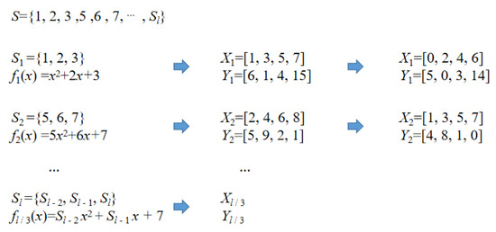 Let the prime number p = 17, take three secret numbers s = {s1, s2, s3} from the secret number sequence S in turn, and use s as the coefficient of the polynomial to generate a second-degree polynomial: