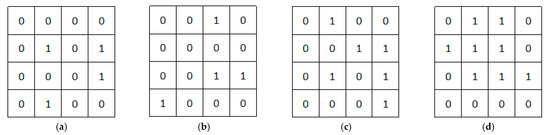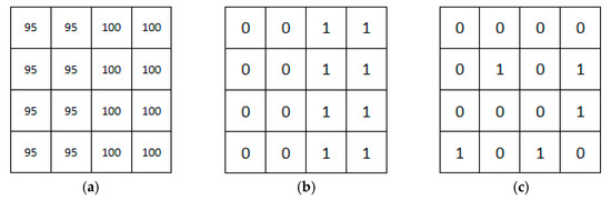 The binary of the first elements in X1, Y1, X2, Y2 are {X11, Y11, X21, Y21} = {[0000], [0101], [0001], [1010]}, respectively. Set the threshold value to T = 10. Figure 4a is an original image block; the triplet of this image block after AMBTC compression is {100, 95, BM}, BM is shown in Figure 4b and H − L = 100 − 95 = 5 < T. Replace the bitmap BM with {X11, Y11, X21, Y21,}, and the modified triplet is {100, 95, [0000 0101 0001 1010]}, as shown in Figure 4c. The 2nd, 3rd and 4th elements of X1, Y1, X2, Y2 are embedded in the compressed bitmaps of the four images in the same way, and so on, embedding all X and Y dimensions into n images, respectively.