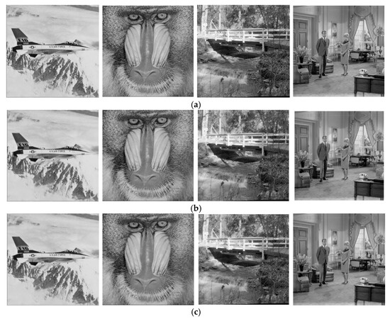 Figure 5 shows 4 bitmaps of triples containing subsecrets, obtained from 4 shadow images stored on different servers. All bits are extracted from these 4 bitmaps, and then every 4 bits are converted into decimal, for example. As shown in Figure 5a, the extracted 16 bits is [0000 0101 0001 0100], which is [X11, Y11, X21, Y21] = {0, 5, 1, 4] after conversion to decimal; the decimal numbers extracted from the remaining 3 bitmaps are [X12, Y12, X22, Y22] = [2, 0, 3, 8], [X13, Y13, X23, Y23] = [4, 3, 5, 1], [X14, Y14, X24, Y24] = [6, 14, 7, 0]. After 1 is added to all elements, the four points {(1, 6), (3, 1), (5, 4), (7, 15)} on the are obtained, while the four points {(2, 5), (4, 9), (6, 2), (8, 1)} on the are obtained. Take any three points on the two functions and bring them into the Equation (1) to restore the coefficients; that is, the embedded secret numbers are {1, 2, 3} and {5, 6, 7}, respectively.
