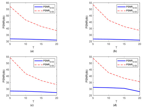 Table 4 shows the comparison results. Columns 6, 7 and 8 in the table give the embedding rate, storage volume and the PSNR of the shadow images, respectively. The methods in [20,21,22,23,24,25] are dual-image data hiding methods, which generate two visually similar shadow images. As shown in Column 8, the PSNRs of the two shadow images generated by [22,23] are highly different. Although the shadow images are meaningful, they are not suitable for practical application scenarios. Many shadow images in [26,27,28] are meaningless ciphertext images. Thus, similar to traditional encryption methods, they also easily attract attackers’ attention. The method proposed in [27] generates multiple meaningless shadow images of the same size by secret sharing of a cover image, and embeds the secret message in the shadow image, while the method in this paper uses multiple carrier images. Therefore, the embedding rate of [27] is higher than that of the method proposed in this paper, and the method proposed in this paper takes the smooth image as the carrier and its storage capacity is much higher than that of [27]. The embedding payload of [28] is bounded by the embedding method. When the PSNR ≈ 35 dB, the maximum payload of [28] is around 0.65 bpp. In addition, the compression ratio of the method proposed in this paper is four, which means that the embedding capacity of our method has obvious advantages under the same storage space.