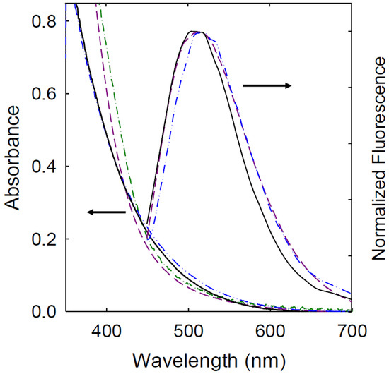Absorption and fluorescence spectra of PEI&PEG-C/TiO2-Dots (solid, black) and PEG-C/TiO2-Dots (dash-dot-dot, blue), with those of PEI-CDots (dash, purple) and aqueous suspended small carbon nanoparticles (dash-dot, green, absorption only) for comparison.