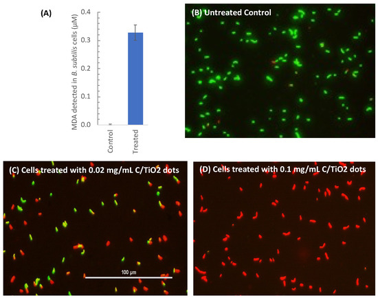 The consequences of the treatment with the C/TiO2 hybrid dots and visible light include the suppression of the intrinsic antioxidant defense capacity of the cells, causing various adverse effects and damage to the cells, such as the oxidation of proteins and the disruption of cell membranes [41,42]. Often accompanying cell membrane damage is the lipid peroxidation [43], a multiple-step process in which lipid carbon-carbon double bonds are attacked by free radicals and/or strong oxidants [44,45,46]. Some studies have demonstrated that free radicals can induce cell membrane damage [47], and the oxidative stress can lead to lipid peroxidation, inhibiting bacterial growth [48]. Other studies have found that the membrane damage by photoexcited TiO2 is often associated with lipid peroxidation [49]. The lipid peroxidation produces lipid hydroperoxides (LOOH) and various aldehydes including especially malondialdehyde (MDA) [50], which is commonly used as an indicator of lipid peroxidation. In this study, the extent of lipid peroxidation in B. subtilis cells upon the treatments of C/TiO2-Dots with visible light was measured by quantifying MDA with a commercial kit (TBARS Assay), which is based on the reaction of MDA with thiobarbituric acid (TBA) to form a red fluorescent adduct [51,52]. Shown in Figure 5A is the increased amount of MDA measured in Bacillus cells after the treatment with 0.1 mg/mL PEI&PEG-C/TiO2-Dots and visible light for 2 h. The amount is significantly higher than that in the untreated control samples, indicating the cell membrane lipid peroxidation caused by the highly reactive species produced in the treatment.