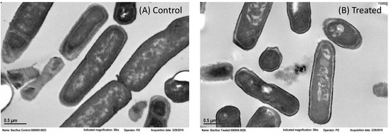 Representative TEM images of B. subtilis cells: (A) untreated, and (B) after treated with 0.1 mg/mL PEI&PEG-C/TiO2-Dots with visible light for 2 h.