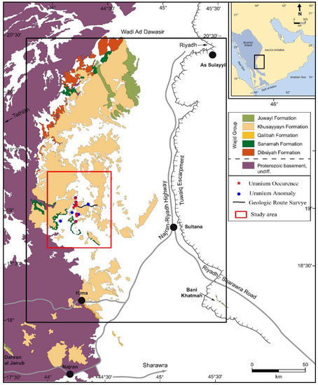 Sedimentary iron ore is an important type of iron ore deposit. Its regional geology, lithology, lithofacies characteristics, and genesis have been studied [1,2,3]. They are mainly distributed in shallow marine, sea land alternating, or lacustrine sedimentary facies, mainly composed of iron quartz sandstone, rich in hematite, limonite, iron carbonate, and iron sulfide [4,5]. Under the humid and hot paleoclimate conditions, the iron-bearing rocks of the ancient continent were lateritized and provided a sufficient source of iron, and the colloidal state of iron was transported to the sedimentary area. Seasonal periodic changes in oxidation potential lead to the interactive deposition of iron hydroxide and sandstone. Generally, the acidic rainy climatic conditions are conducive to the formation of ferruginous sandstone [6,7]. It is also noted that a small part of ferruginous sandstone is rich in radioactive elements such as uranium and yttrium [8,9,10,11,12,13]. Uranium anomalies were found in the ferruginous sandstone of the Wajid Group in southern Saudi Arabia [14,15]. This study is based on field surveys and radiometric ground surveys in the Wajid Group sandstone outcrop and sample testing research to analyze the metallogenic conditions of the uranium, evaluate the uranium potential, and delineate the uranium prospects. The purpose of this paper is to generally summarize the characteristics of the lithology and lithofacies of the ferruginous sandstone and to comprehensively analyze the genetic mechanism of uranium concentration in ferruginous sandstone.