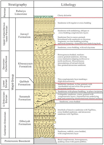 The Wajid Group of southern Saudi Arabia was named by Gierhart and Owen in 1948 [32,33,34]. It unconformably overlaid the Precambrian basement rocks and was overlain by the late Permian Khuff Formation [35,36]. The lithology of the Wajid Sandstone, ranging in age from the Cambro–Ordovician to the Lower Permian, consists primarily of medium and coarse-grained sandstone. The former research results indicated that the Wajid Group could be divided into five formations: the Dibsiyah Formation, the Sanamah Formation, the Qalibah Formation, the Khusayyayn Formation, and the Juwayl Formation [23,37,38]. Most of these formations are separated by major unconformities (Figure 2).
