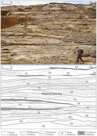 The lower member of the Dibsiyah Formation is predominantly composed of medium to coarse-grained sandstone, trough cross-bedded sandstone deposited in high-energy braided stream channel environments [36,37,38,39]. The Upper Dibsiyah Formation represents a vast sand–sheet complex with the core and margin facies formed under fluvial to shallow-marine conditions. The Sanamah Formation records the Late Ordovician Hirnantian glaciation with coarse sandstones and conglomerates [23,40]. A variety of glacier-induced sedimentary structures are present. The latest of these cycles is overlain by a few meters of marginal-marine sediments of the Qalibah Formation. The Khusayyayn Formation, probably deposited during the Early Devonian, represents a shore environment characterized by the dominance of mega-scale and giant cross-beds and bed sets [41,42,43]. The Juwayl Formation of the late Carboniferous was deposited at the interface of the Late Palaeozoic Gondwana ice shield, with a large lake that may have covered most of southern Arabia and the adjacent areas [23,44].