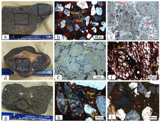 Ferruginous sandstone lithology and alteration features in Wajid Sandstone. (a–c) Y5.1/SR08: Dark grey coarse ferruginous sandstone. Ferrous cemented quartz sandstone: Quartz is the main mineral particle that contains a small amount of feldspar, hematite, and limonite filling the space between mineral particles. (d–f) Y5.1/SR07: Dark grey and brownish-yellow gravel-bearing coarse ferruginous sandstone. Quartz is the main mineral particle, with a gravel structure. Hematite primarily fills the spaces between the mineral particles and occurs in the intergranular pore and intragranular dissolved pores. (g–i) Y5.1/SR06: Dark grey coarse ferruginous sandstone. Hematite can be seen in the sandstone. Sericite alteration occurs on the surface of the feldspar particles, and goethite fills the spaces between the mineral particles. Q—quartz; Hem—hematite; Lm—limonite; Ser—sericite; Gt—geothite.