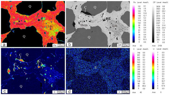 Element distribution of ferruginous sandstone in Wajid Group (Y5.1/SR08). (a) Distribution map of iron element content, including hematite in red area with high iron concentration and limonite with micropores in yellow area; (b) Cathodoluminescent photograph of sample; (c) Distribution map of organic matters; (d) Distribution map of uranium. Q—quartz; Hem—hematite; Lm—limonite; C—organic carbon; U—uranium.