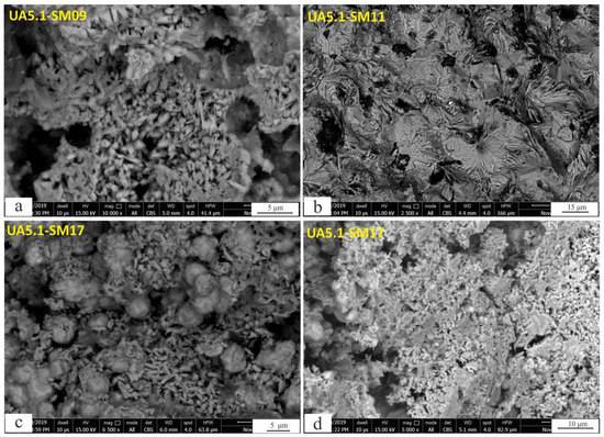 SEM characteristics of ferruginous sandstone of Wajid Group. (a) UA5.1/SM09: granular ferrous oxide aggregate; (b) UA5.1/SM11: filamentous ferrous oxide; (c) UA5.1/SM17: spherical and granular ferrous oxide aggregate; (d) UA5.1/SM17: granular ferrous oxide aggregate.