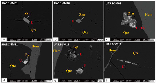 Existence form of uranium minerals in the Wajid Sandstone. (a,b) Zircon minerals contain a small amount of uranium; (c) Uranium and thorium are wrapped in zircon; (d) Uranium is adsorbed by pyrite on the surface of quartz; (e,f) Uranium occur in fissures of gypsum and quartz. Qtz—quartz; Zrn—zircon; U-uranium; Th—thorium; Hem—hematite; Py—pyrite; Gp—gypsum.