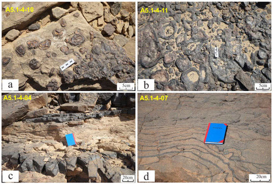 Synsedimentary and later diagenesis ferruginous sandstone in study area. (a,b) Ferruginous concretion formed in the sedimentary period with eU content of 30–40 ppm; (c) Uranium anomaly in ferruginous sandstone formed in the sedimentary period, 15–30 cm thick, later transformed with eU content of 341.74 ppm; (d) Ferruginous sandstone formed in later diagenesis period, 2–4 cm thick, with eU content of 5.2 ppm.