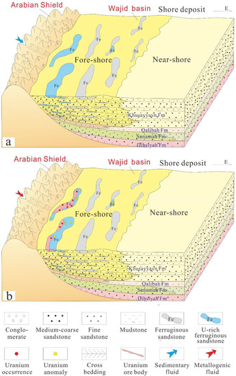 Uranium metallogenic model of Wajid ferruginous sandstone. (a). Sedimentary and diagenetic period of ferruginous sandstone; (b). Ferruginous sandstone transformation period.