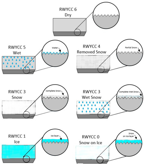 Among the work carried out to implement this global standard, Transport Canada published the Advisory Circular (AC, Ottawa, ON, Canada) No. 300-019 [22]. The GRF principle implies that at any time when water, snow, slush, ice, or frost are present on an operating runway, the airport operator evaluates the runway surface conditions. This evaluation yields a RunWaY Condition Code (RWYCC) and a description of the runway surface, which the flight crew may use to calculate airplane performance. The airport operator’s best evaluation of the runway surface quality is based on this format, which is based on the type, depth, and coverage of contaminants. However, other relevant factors should be considered as well, and the changes in circumstances should be notified as soon as possible.